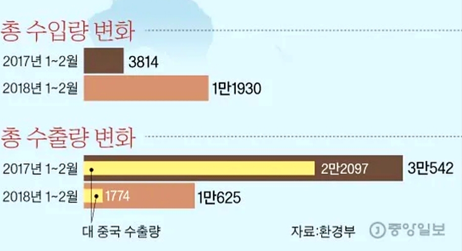 재활용 쓰레기 수출이 어려워졌고 동시에 중국으로 향하던 것들이 한국으로 들어오게 된 것 입니다.