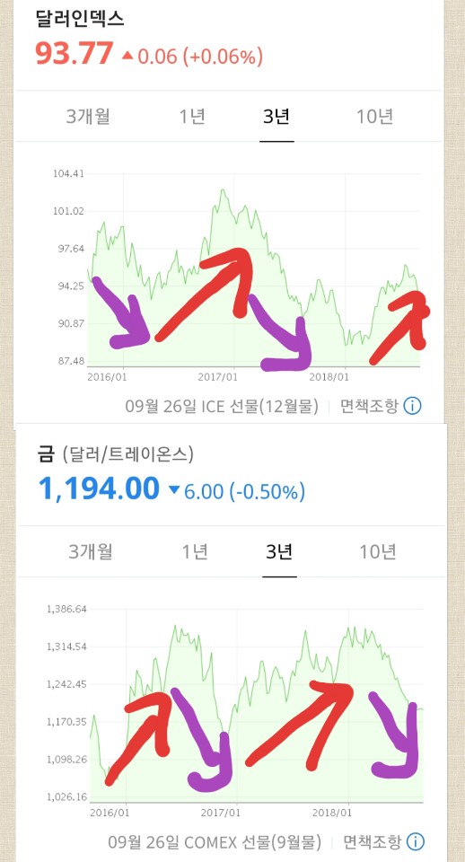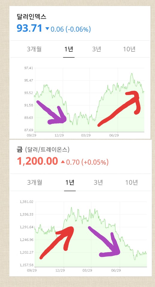 1년을 기준으로 보았을 때 달러의 힘이 강해지면 금값이 하락하고 약해지면 상승하는 것을 볼 수 있습니다.