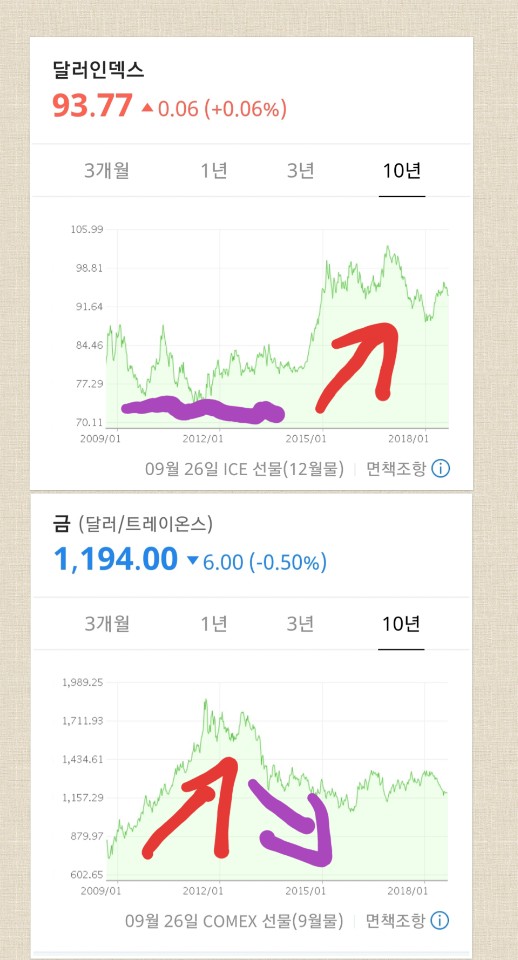 10년의 경우 달러가 계속 낮은 힘을 갖고 있을 때 금값이 꾸준히 오른 것을 볼 수 있습니다.