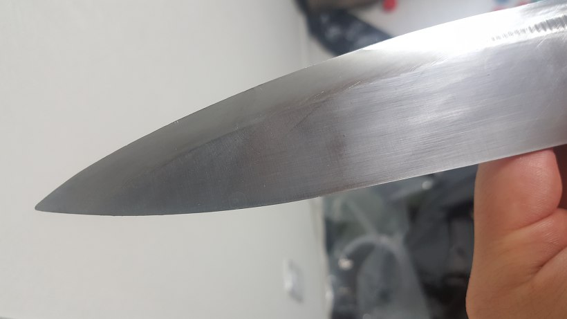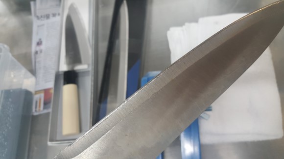 칼 가는 방법을 간단히 설명 하자면, 칼 코끝 부터 반대쪽 몸통날까지, 한번에 갈아주는게 포인트 입니다만....