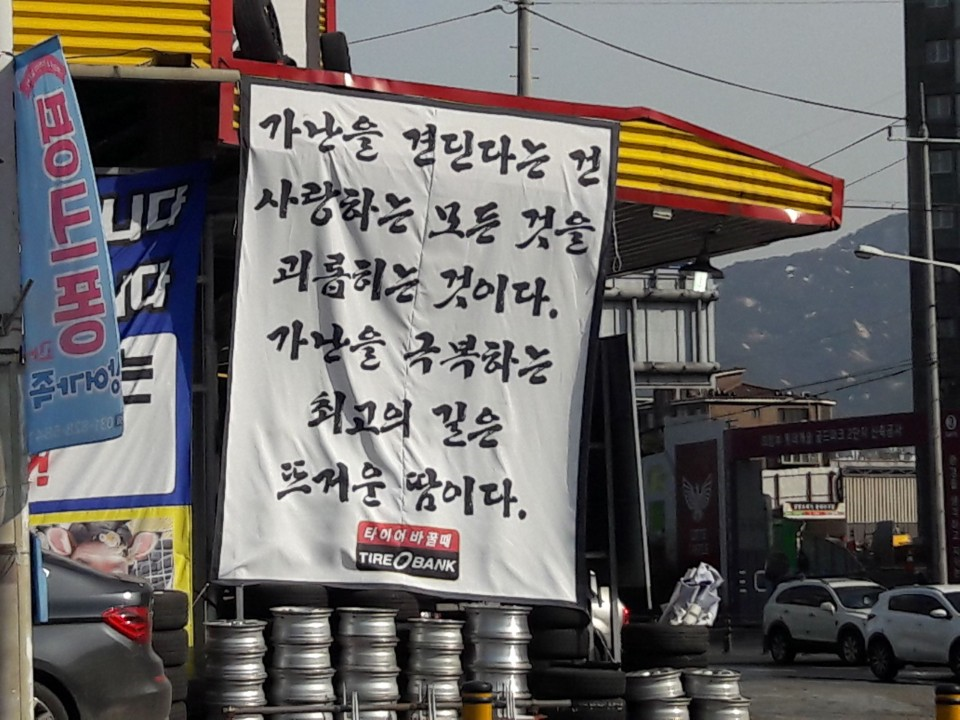 땀과 열정lovedj (58)in #kr • 8 years ago (edited) 도로 운전 중 눈에 띄어 한 컷 찍어 올려봅니다. 글 귀에는 타이어 사장님의 굳센 의지와 열정이 담긴 듯하여 마음이 뭉클했습니다. #life #lovedj
