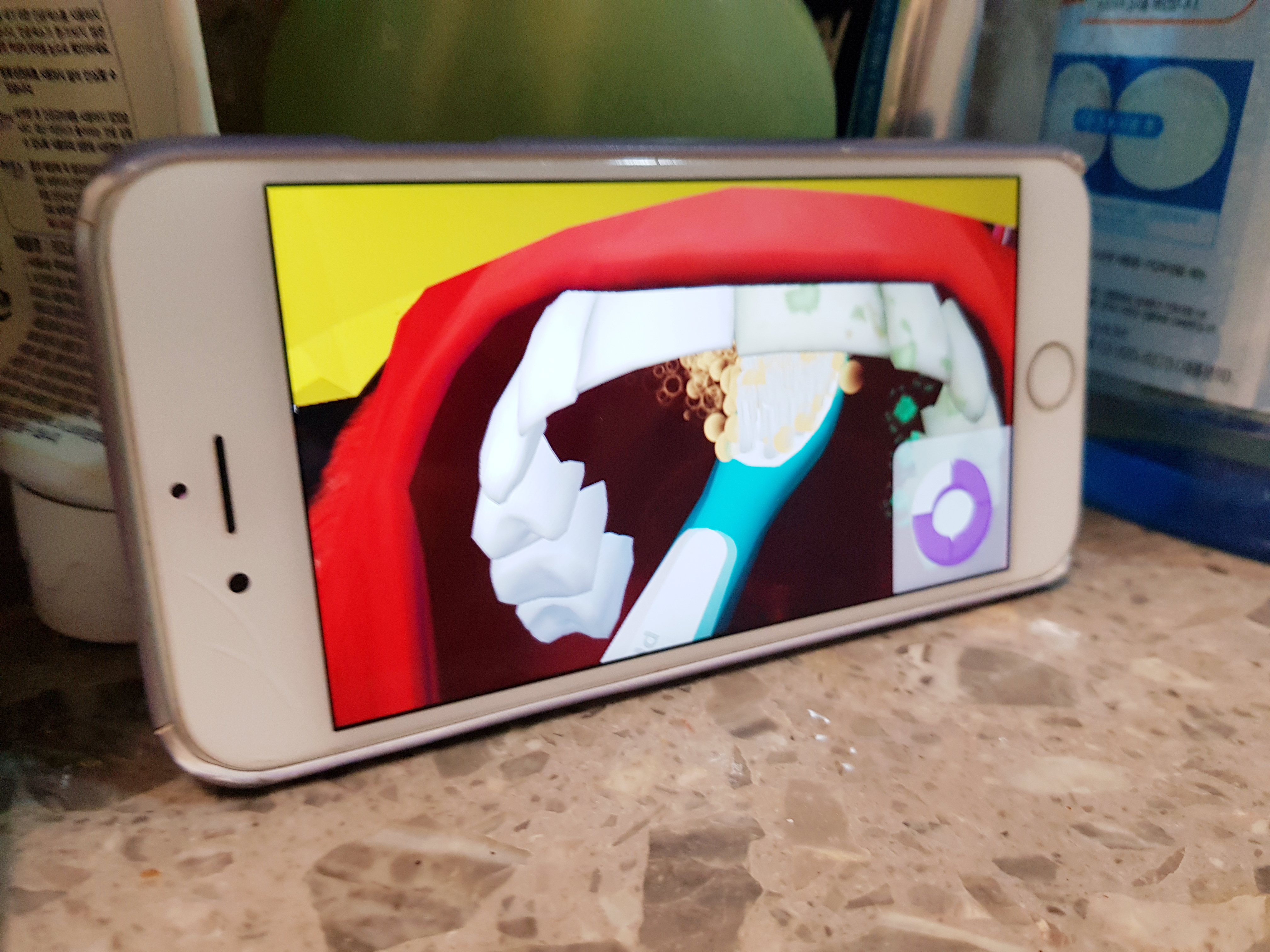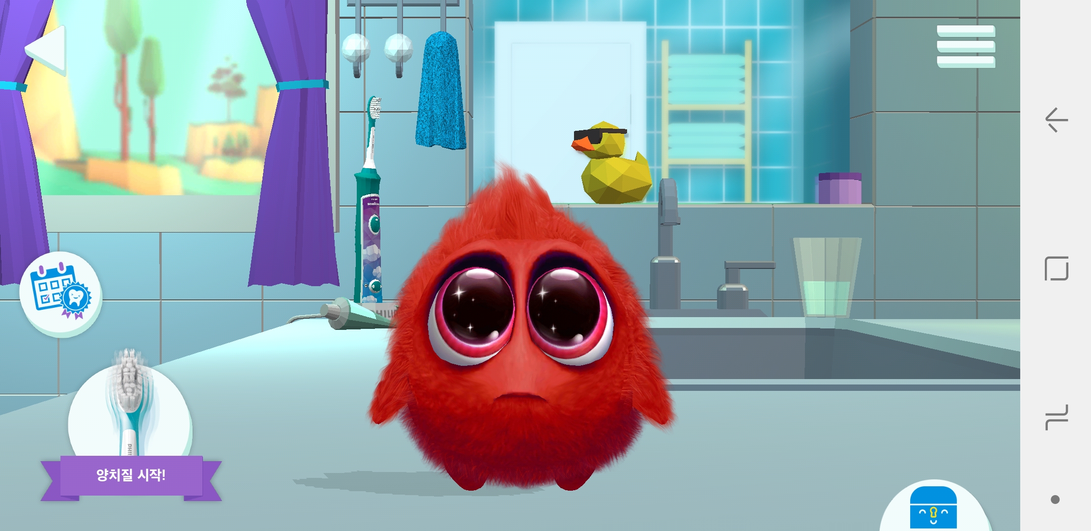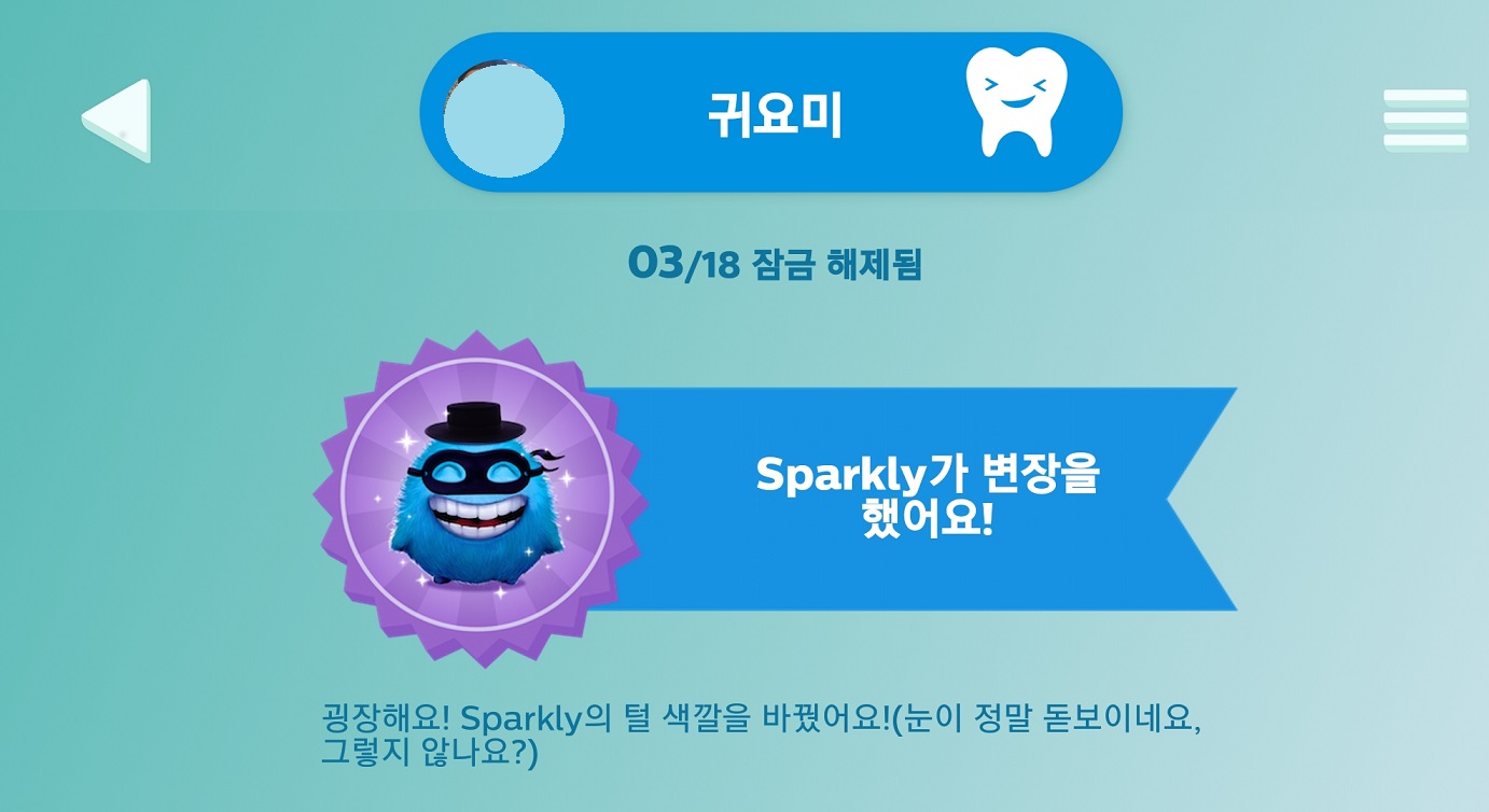 전동칫솔과 앱이 블루투스로 연결이 되어 아이가 이를 닦고 나면 보상이 주어져서 그 보상으로 캐릭터를 키워 나간답니다.