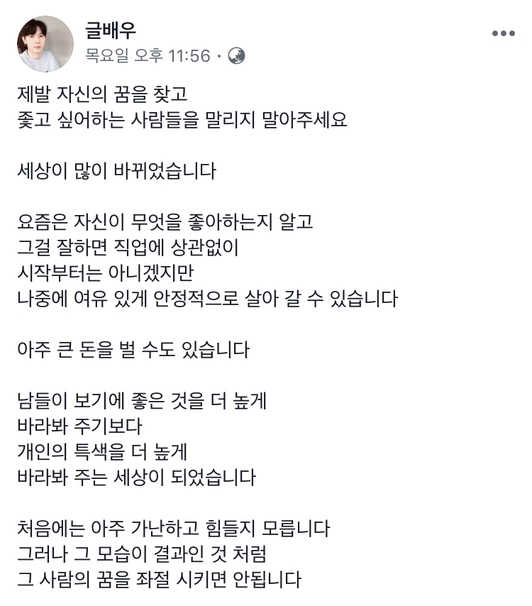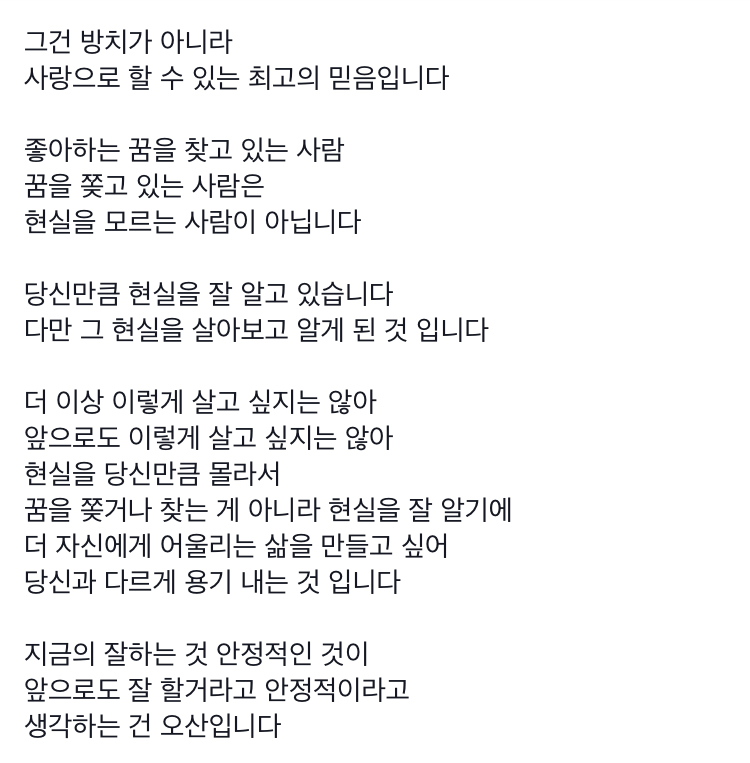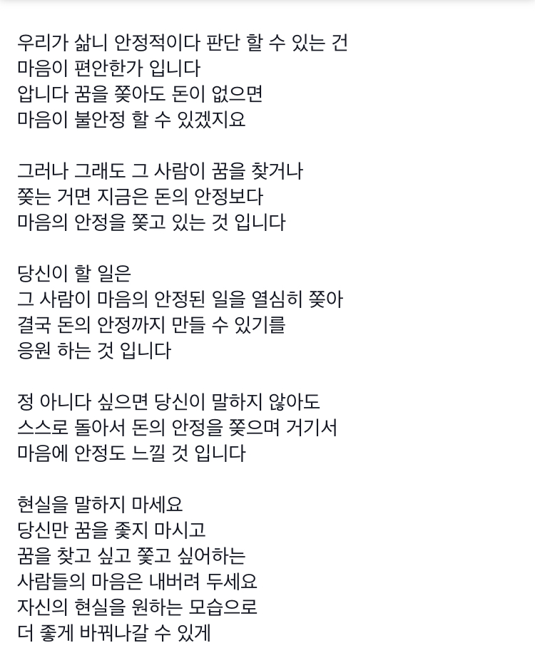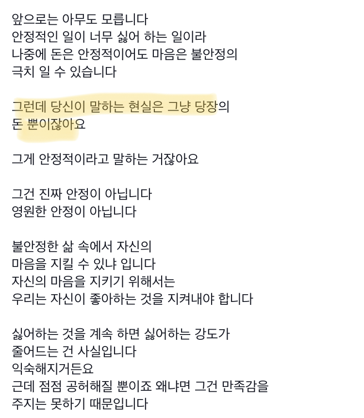 최근들어 꿈도 없어졌고, 돈도 없어졌고, 자신감도 없어졌습니다. 이게 현실에 맞는 어른이 되는구나 라는 생각이 들어 그냥 받아들여 보기로 했습니다.