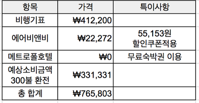 총합계 765,803원. 비행기와 숙박비 포함 1인 당 382,901원이라는 착한 예산안이 확인됩니다.