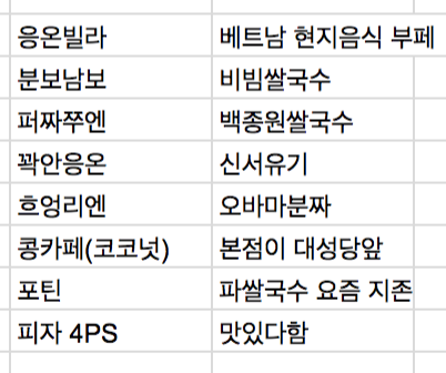 응온빌라, 분보남보, 퍼짜쭈엔, 꽉안응온, 흐엉리엔, 콩까페, 포틴, 피자4ps...