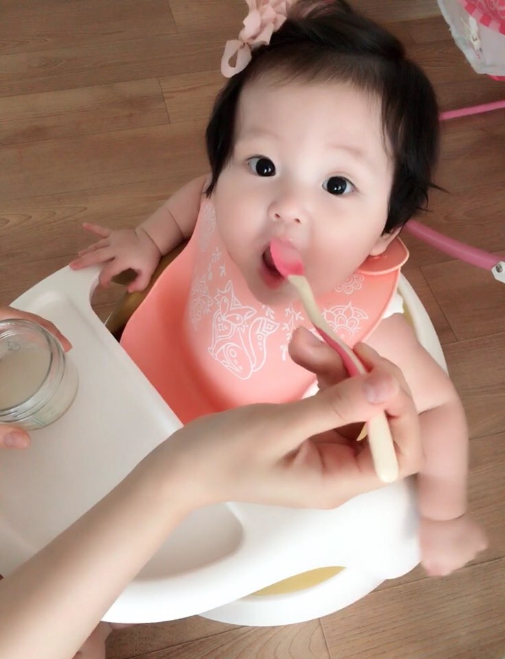 이유식 먹는 또랑또랑한 눈망울의 아가 너무너무 귀여워용