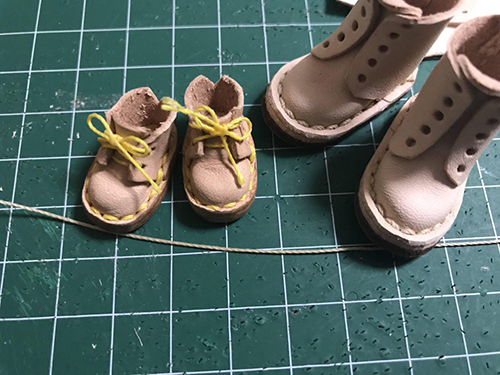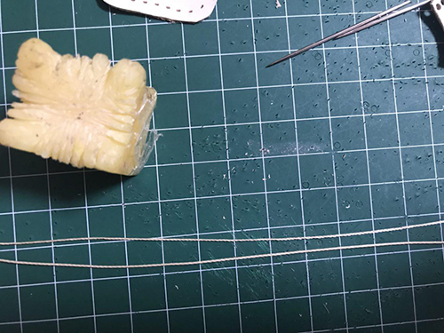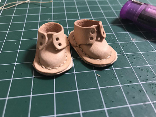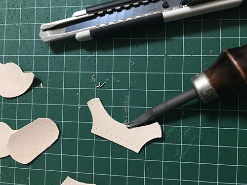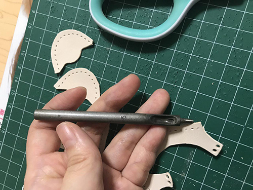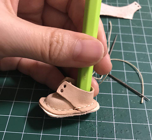▶ 치즐로 바느질구멍을 뚫어주고 신발끈 끼우는 부분은 2mm펀치로 구멍을 만들어줍니다.