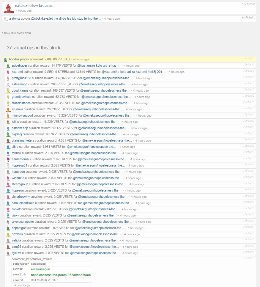등등 거의 대부분의 트랜잭션들이 포함되어 있다.하지만 이 블럭에는 37개의 virtual OPS도 포함되어 있다.
