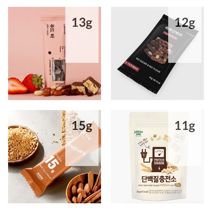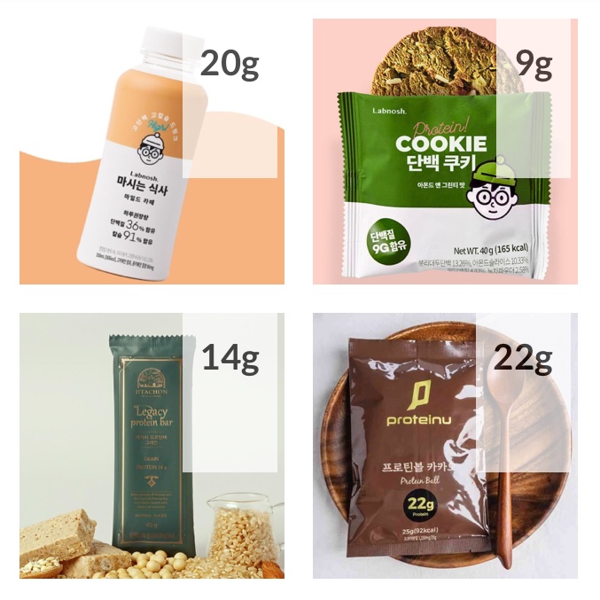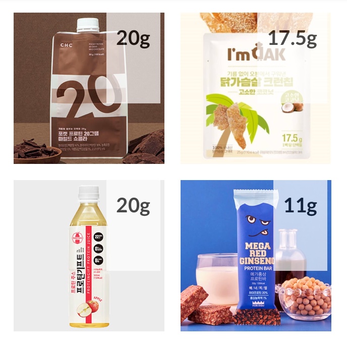 프로틴 듬뿍 카페라떼, 그린티 프로틴 쿠키, 촉촉한 수제 프로틴바, 초코 프로틴 시리얼, 닭가슴살 크런칩, 초코 프로틴쉐이크, 사과맛 프로틴워터, 프로틴 스낵 순한맛, 시나몬 프로틴바, 닭가슴살 육포, 닭가슴살 꾸이칩, 각종 프로틴바 등등