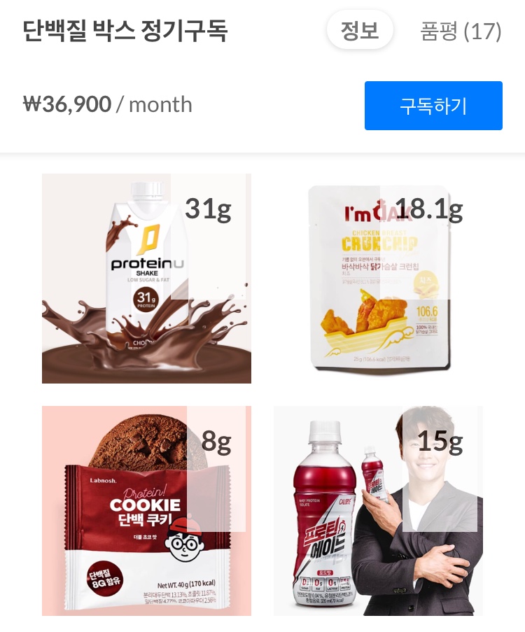 *단백질은 다른 영양소에 비해 매우 비쌉니다. 제품별 가격대는 2천원대에서 6천원대까지 다양하죠. 단백질 박스를 통해 저렴하게, 편리하게 단백질을 보충하세요.