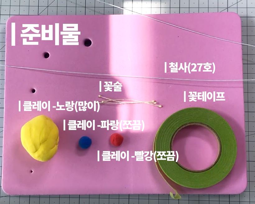 노란색 클레이는 메인 꽃잎 색이구요. 파란색,빨간색은 꽃밭침을 만들 올리브색 제조를 위해 필요해요 ㅎㅎ