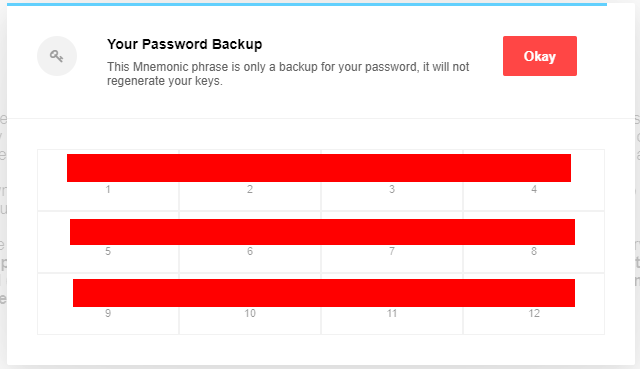 다음으로 아래와 같이 12 단어가 보이게 됩니다. 이는 메타나 여러 지갑들을 사용해 보셨으면 아실겁니다. 백업 12단어 입니다.