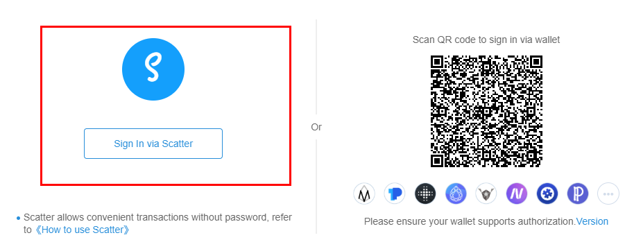 https://newdex.io/trade/ 그리고 사인인 버튼을 클릭해 주면 다음과 같은 화면이 뜨게 되는데 여기서 왼쪽의 스캐터 로그인을 선택해 주면 됩니다.