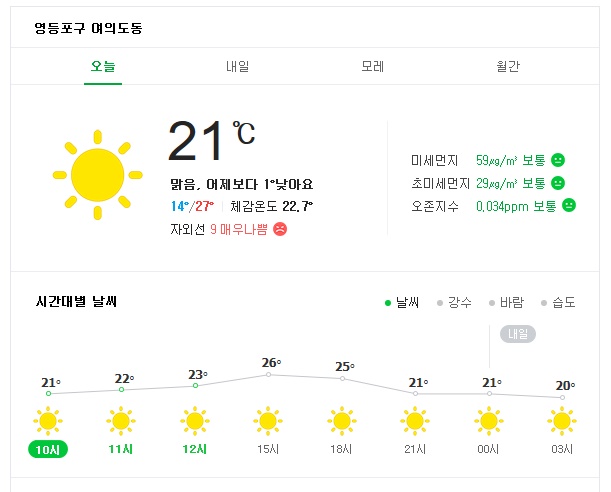 오늘 여의도의 날씨는 어제보다 약간 낮은 기온입니다