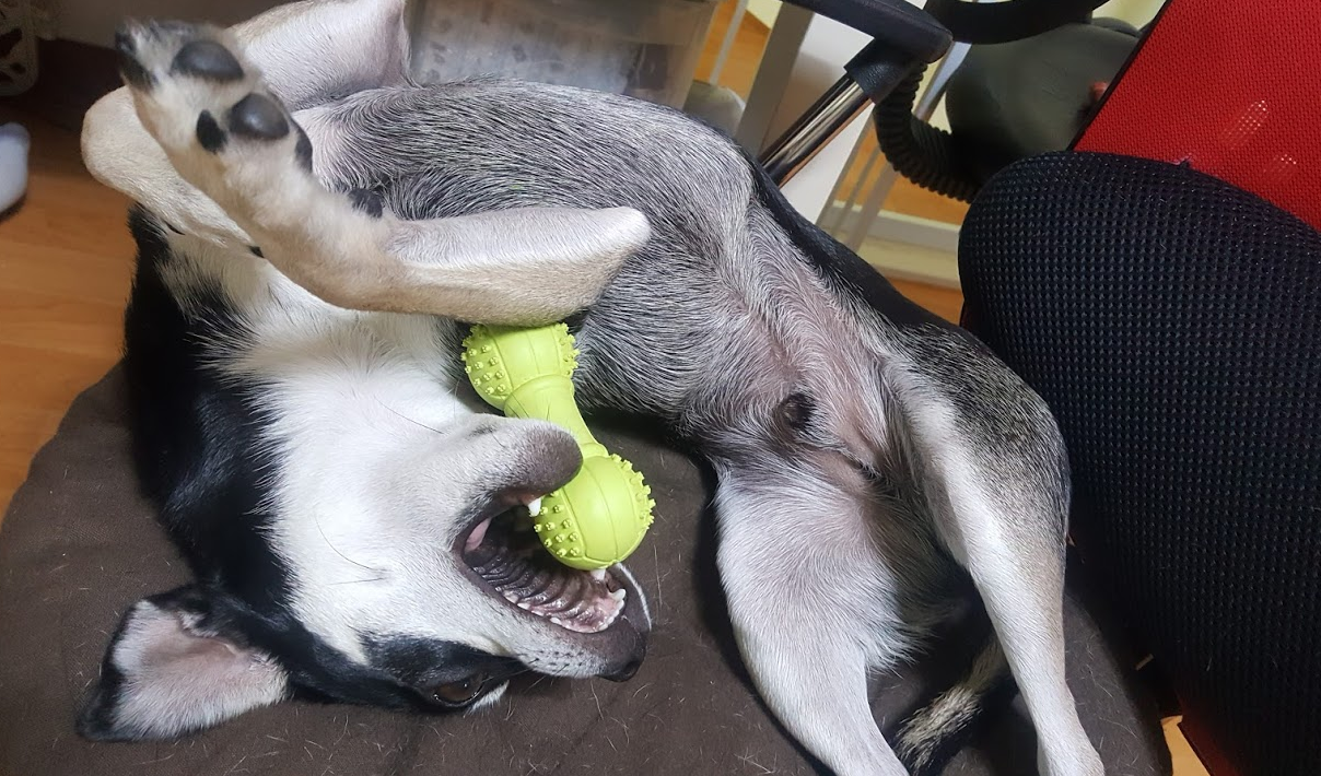 점심을 먹고 나면 놀아달라고 장난감을 가지고 와서 물고 뜯고 맛봐요.