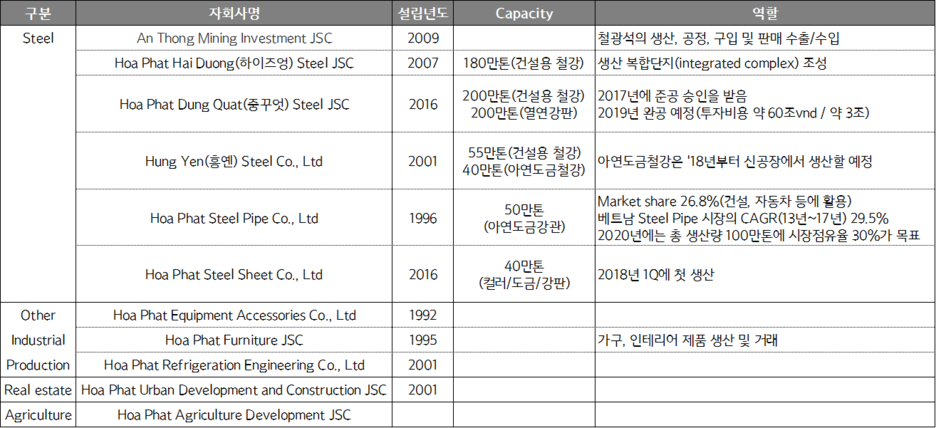 베트남의 포스코라 불리우는 Hoa Phat Group(이후 HPG)은 1992년 건설기계 무역업무를 시작으로 1995년 가구, 1996년 강관(Steel Pipe), 2000년 강철(Steel) 2001년 냉동 장비(Refrigeration)의 생산 또는 무역 그리고 부동산으로 사업분야를 확장시켜 나갔습니다. 2007년에는 아래와 같은 지주회사 구조로 개편하고, 모회사인 Hoa Phat Group Joint Stock Company를 호치민증권거래소에 상장시켰습니다.