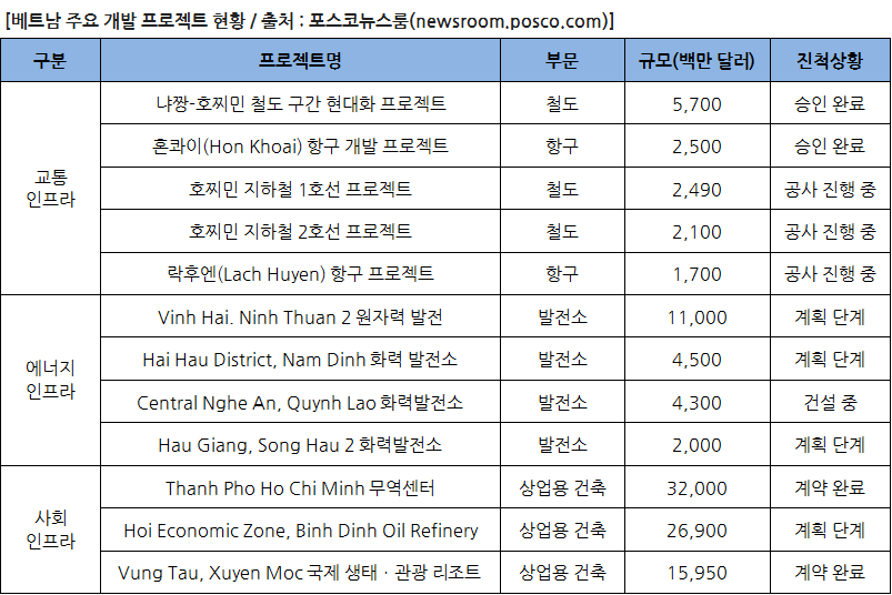 베트남은 매년 GDP 성장률 7%로 성장하는 국가입니다. 하지만 '16년 기준으로 베트남의 도시화율은 34%에 불과합니다. 중국 57%, 인도네시아 54%, 태국 52%, 필리핀 44%에 비해 매우 낮은 수치입니다. 이는 다른 국가에 비해 성장의 여력이 더 크다는 반증입니다. 정부는 도시화율을 증가시키기 위해 도로, 철도, 공항, 항구등의 교통인프라, 에너지인프라, 사회 인프라같은 개발 프로젝트를 계속해서 추진 중이고, 현재까지 주요 프로젝트의 규모는 111,140백만$에 달합니다.