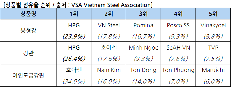 이를 타사의 조강 판매량과 같이 비교해 보도록 하겠습니다. 아래 테이블과 같이 생산가능량과 판매량이계속 증가하고 있으며, 점유율이 증가한 회사는 HPG가 유일합니다. HPG의 점유율은 증가한 반면, 나머지 회사들의 점유율은 낮아져 HPG의 지위가 강화된 것으로 보입니다.