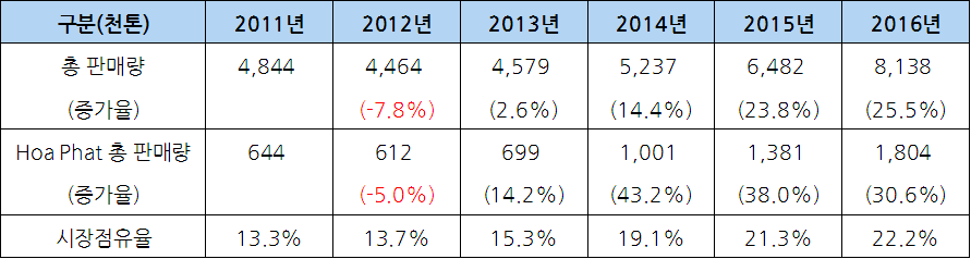 베트남 철강 시장은 계속 증가하고 있는 가운데, HPG의 점유율도 계속 확대되고 있습니다. 먼저 조강시장은 시장 전체적으로는 '15년부터 증가율이 20%가 넘어갈 정도로 발전의 속도가 빨랐으며, HPG의 판매량 증가율은 더 높은 수치를 나타내며 '16년에는 시장점유율 22.2%까지 증가하였습니다.
