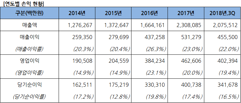 이러한 규모의 확장은 연도별 손익상황으로 한번 더 확인할 수 있습니다. '15년까지는 매출액 및 이익의 성장률이 7~8% 사이에 그치다가 '16년부터는 매출액과 이익의 성장률이 20%를 넘어서게 됩니다. 특히 '16년도의 영업이익성장률은 56%, 당기순이익 성장률은 88%에 이르게 됩니다. 이는 생산량 증가에 따른 고정비 Share 증가로 매출이익률 상승, 관리비 감소('15년 약 380억에서 '16년 200억 수준으로 감소. '17년도 200억 수준으로 유지 '18년 3Q 누적으로는 116억)에 따른 영업이익률 상승 2가지가 주요한 요인으로 보여집니다.(※ 관리비 감소의 원인은 확인이 안됨)