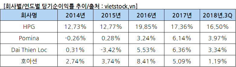 여기서 수익률의 가장 큰 차이를 가져오는 것이 원료 수급비용입니다. 일반적으로 전기로 원료인 고철 비용을 75%라고 하면 고로의 원료인 철광석(+코크스, 석회석)의 비용은 약 50%정도라고 할 수 있습니다. 또한 고철은 베트남에서 충분하지 않아 대부분을 높은 가격으로 수입을 하고 있는 반면, HPG는 원료의 Mining에서 철강 생산까지 수직계열화시켜 타사 대비 높은 수익율을 나타내고 있습니다.