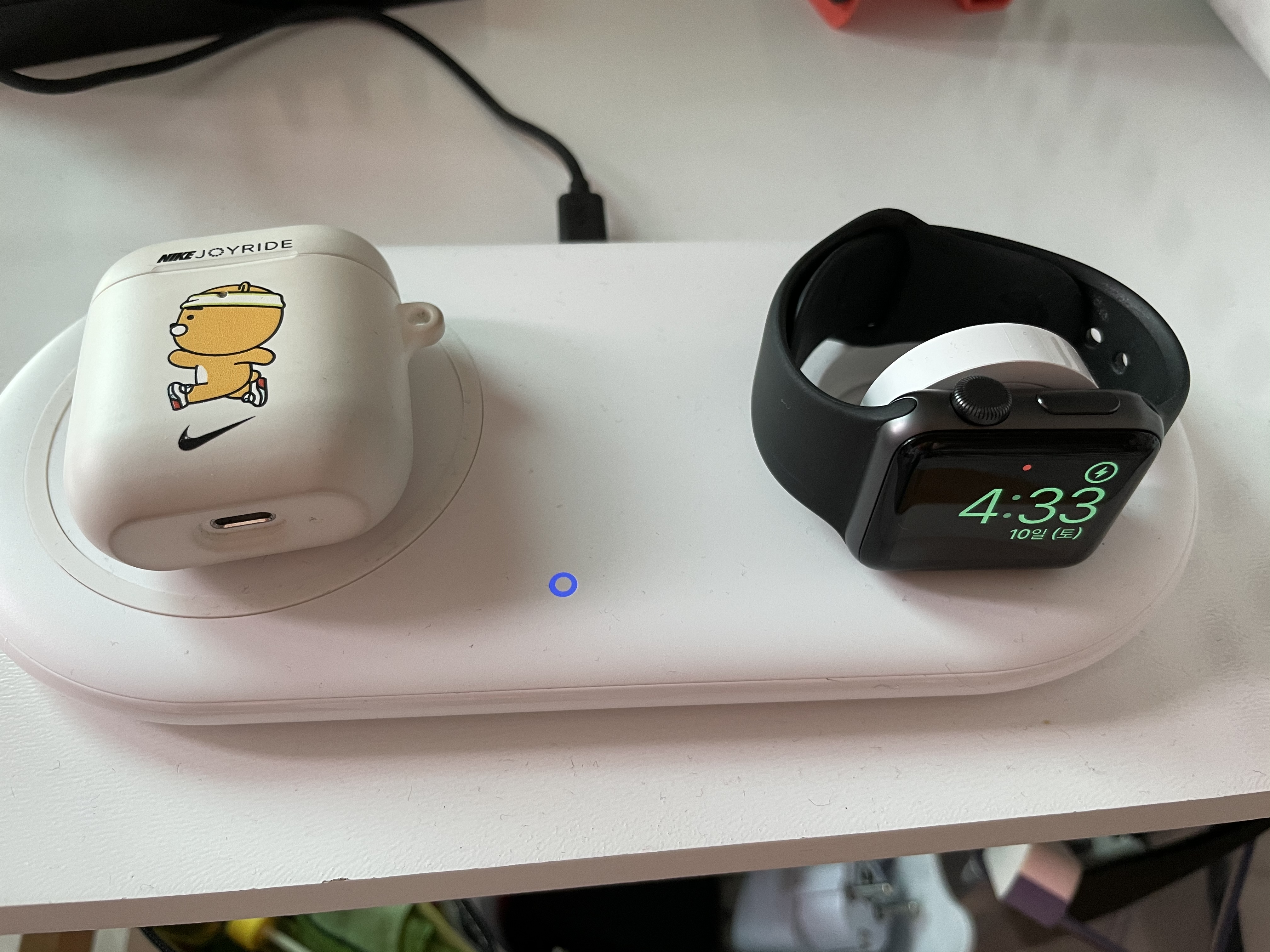 이 제품 구매 후 저의 충전 패턴은 퇴근하면 에어팟을 무선충전 패드 위에 올려놓고 할일을 하다가 (무선충전케이스에요)
