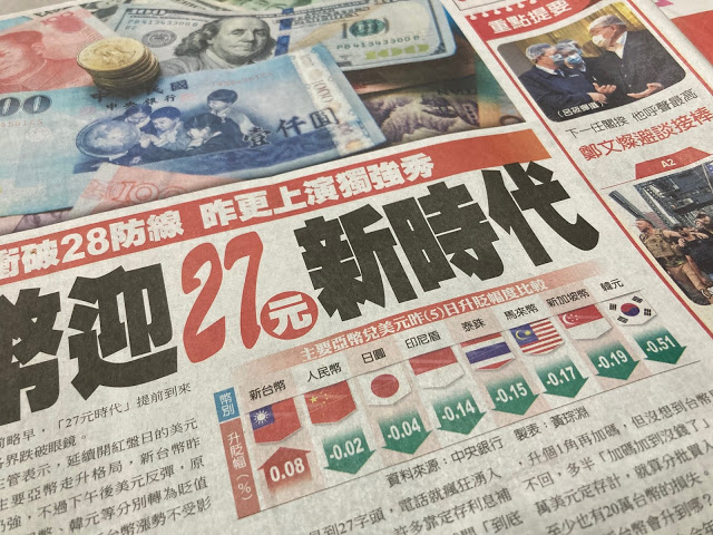 대만달러 가치 23년만에 최고치! 달러당 27NTD 무너져