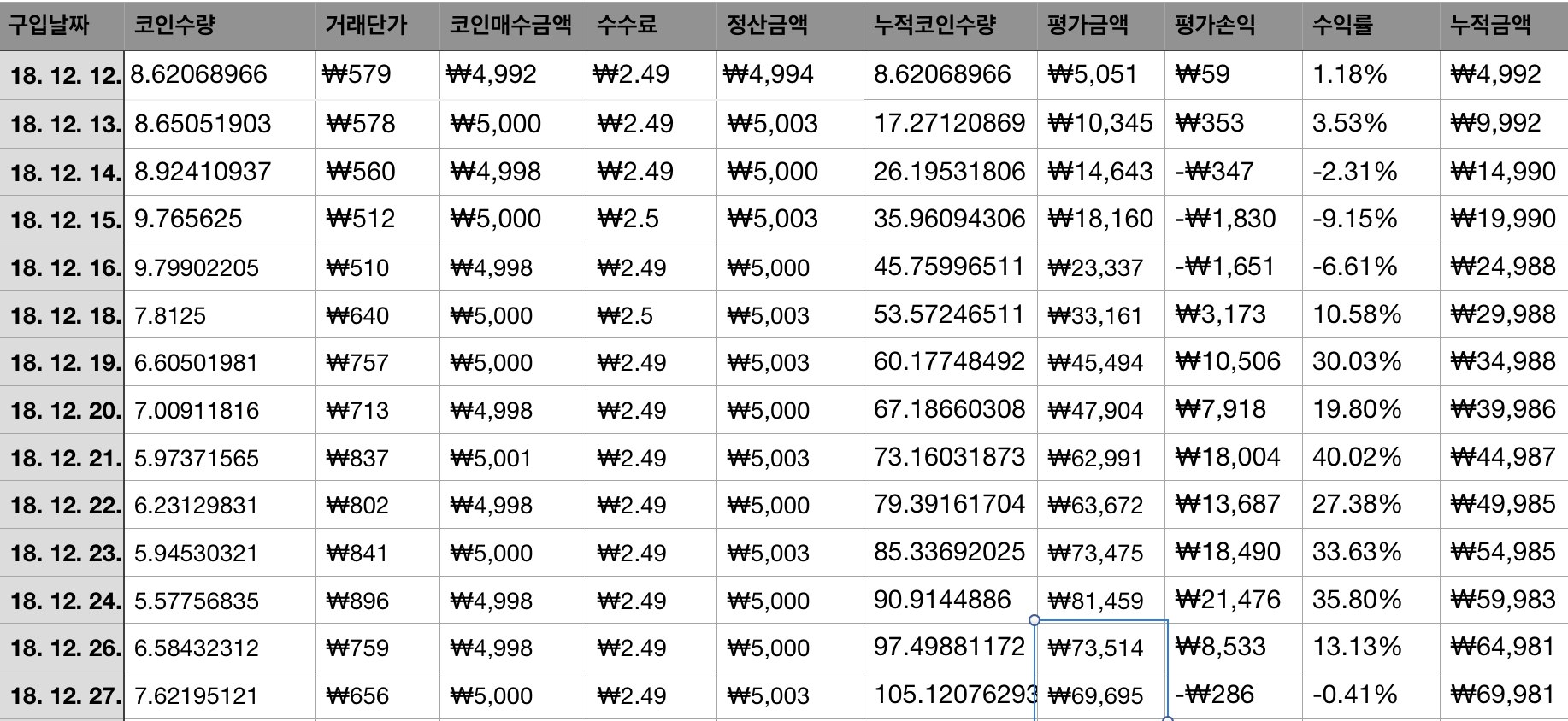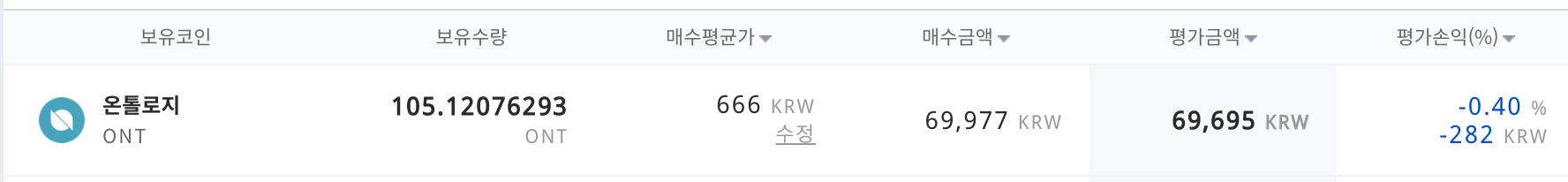 [14회차] 매일 커피 한잔값으로 코인을 산다면 수익률은??okbox (45)in #kr • 7 years ago 매일 커피 한잔값으로 코인에 투자한다면 1년후 수익률은 어떻게 될까요? 방법 : 매일 코인5천원씩 매수 현재상황 코인명 :온톨로지(ONT) 평가손익: ₩-282 수익률 :-0.40% #jjangjjangman #coin #life