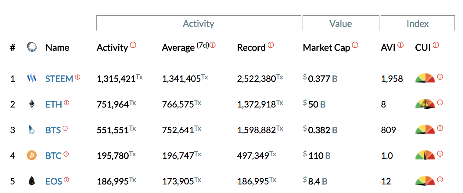 여기서 볼 수 있듯, 1,3,5 위는 라리머의 손을 거친 DPOS 인 스팀, 빗쉐어, 이오스가 차지하고 있습니다. 그리고 스팀의 경우는 상당히 오랫동안 압도적인 양의 트랜잭션을 처리해 오고 있었습니다.