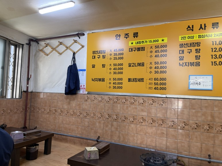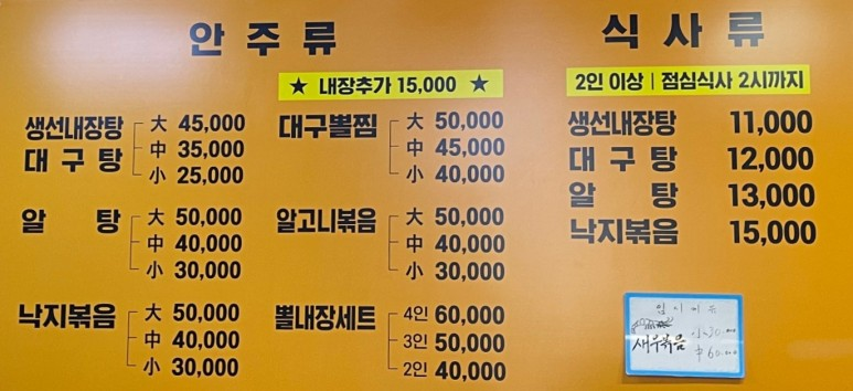 메뉴판에 없지만 세트 메뉴가 있다 ← 메뉴 주문시에 n명 세트 주세요~ 라고 하시면 됩니다. 그러면 대구 뽈짐+대구탕이 같이 나옵니다! (가격 : 명당 20,000원 _ 2022.04 마지막주 기준) 공기밥 별도