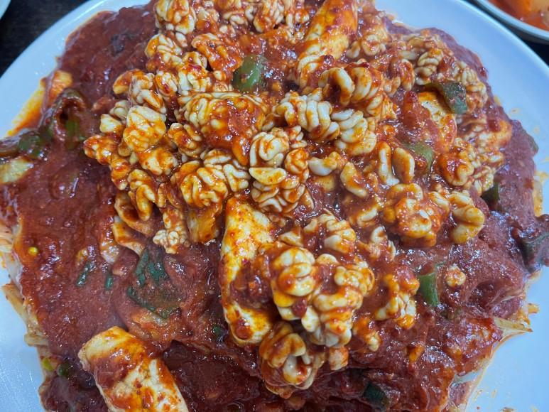 뽈찜 위에 고니와 알이 잔뜩 있는데 정말 신선하고 맛있습니다.