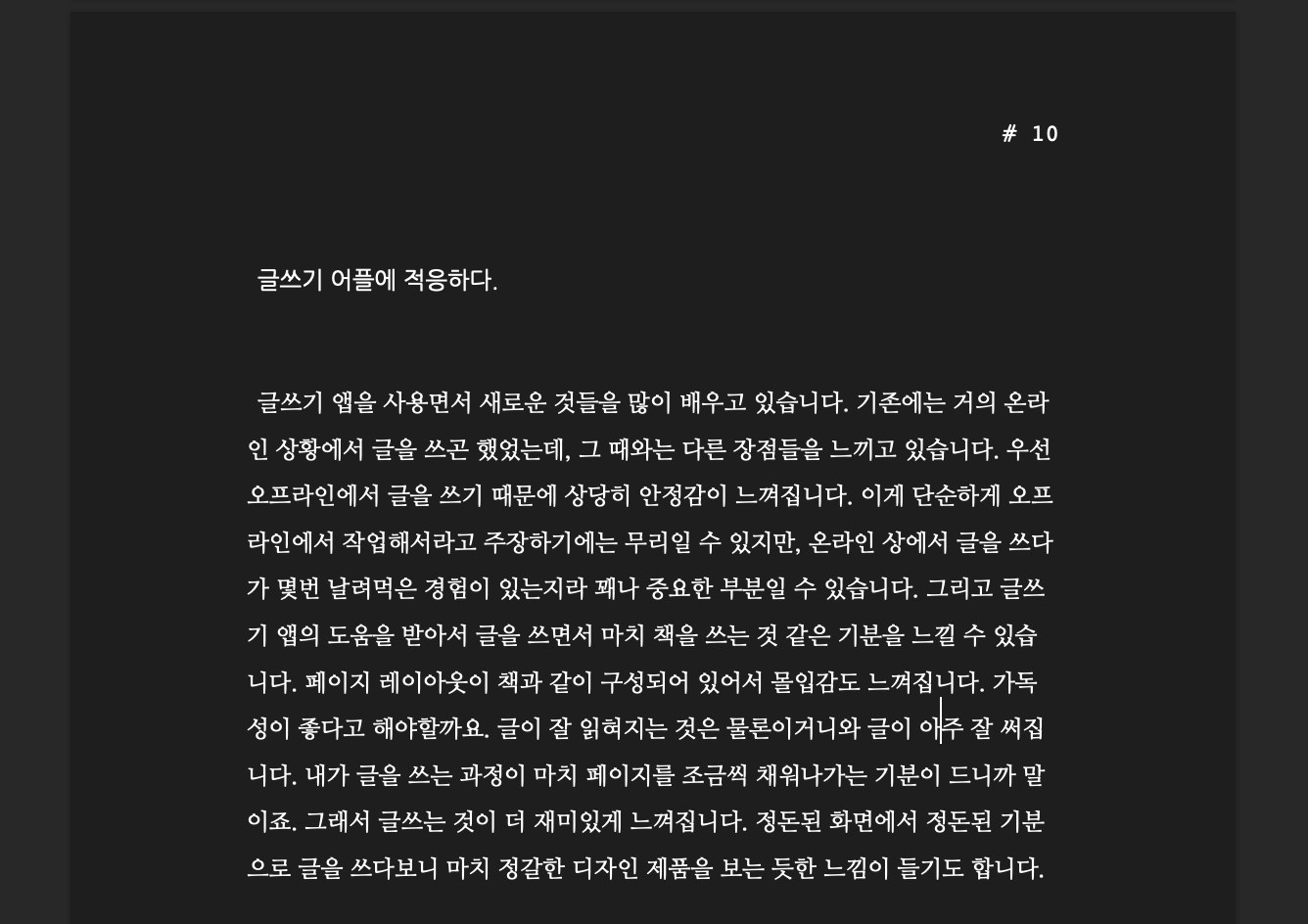 글쓰기 앱을 사용면서 새로운 것들을 많이 배우고 있습니다. 기존에는 거의 온라인 상황에서 글을 쓰곤 했었는데, 그 때와는 다른 장점들을 느끼고 있습니다. 우선 오프라인에서 글을 쓰기 때문에 상당히 안정감이 느껴집니다. 이게 단순하게 오프라인에서 작업해서라고 주장하기에는 무리일 수 있지만, 온라인 상에서 글을 쓰다가 몇번 날려먹은 경험이 있는지라 꽤나 중요한 부분일 수 있습니다. 그리고 글쓰기 앱의 도움을 받아서 글을 쓰면서 마치 책을 쓰는 것 같은 기분을 느낄 수 있습니다. 페이지 레이아웃이 책과 같이 구성되어 있어서 몰입감도 느껴집니다. 가독성이 좋다고 해야할까요. 글이 잘 읽혀지는 것은 물론이거니와 글이 아주 잘 써집니다. 내가 글을 쓰는 과정이 마치 페이지를 조금씩 채워나가는 기분이 드니까 말이죠. 그래서 글쓰는 것이 더 재미있게 느껴집니다. 정돈된 화면에서 정돈된 기분으로 글을 쓰다보니 마치 정갈한 디자인 제품을 보는 듯한 느낌이 들기도 합니다.