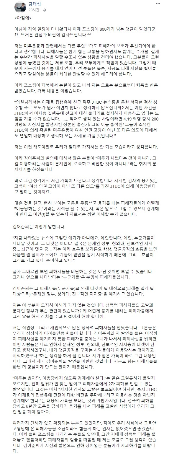 이 사실관계를 잠깐 정리하면, 저는 '미투를 공작에 이용하려는 자들이 있다.'라고 했지 미투가 공작이라고 한 적이 없습니다. 제가 바보도 아니고. 그리고 이제 금태섭 의원이 문제제기를 했어요. 금태섭 의원의 주장의 요지는 그런 제 말이 미투운동을 약화시킬 수 있다. 이런 문제의식이에요. 금태섭 의원은 할 수 있는 말을 한 겁니다. 본인의 입장에서. 그러니까 금태섭 의원과 저를 싸움 붙이는 건 소용이 없으니까 그만들 하시고.