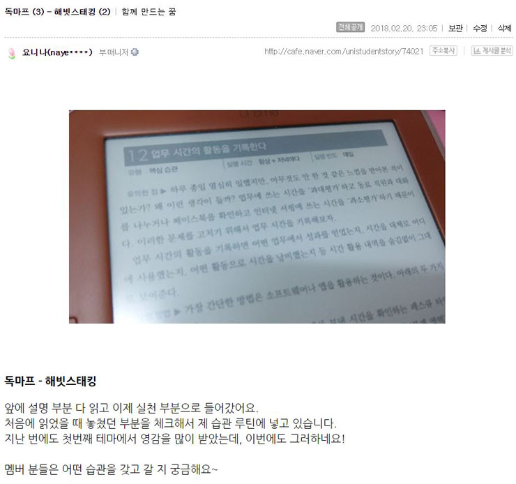예전 같으면 '바쁜 데 무슨 책이야?' 이런 생각으로 책을 멀리 했을텐데, 바쁜 일정에도 책 읽을 시간을 냈다는 것이 가장 좋은 점 같아요.