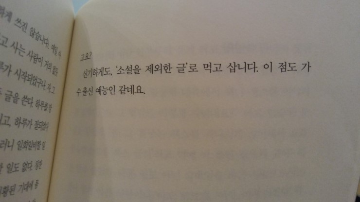 소설가 이지만 '소설을 제외한 글'로 먹고 산다는 작가. 그런 자신을 가수출신 예능인에 비유했습니다. 전공을 살리지 못한 사람들과 돈 때문에 하는 일고 하고 싶은 일을 생각하게 하는 문장이었어요. 그렇지만 작가는 소설은 아니지만 기고도 하고 에세이도 쓰면서 그럭저럭 일을 하며 하고 싶은 소설을 씁니다. 나도 그런 사람의 타협점을 찾아 하고싶은 일과 덜 하고싶은 일을 하며 살고 싶어요. 하고 싶지 않은 일은 최대한 줄이면서 말이죠.