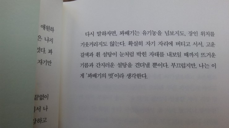 "확실히 자기 자리에 버티고 서서, 고운 갈색과 흰 설탕이 눈처럼 박힌 자태를 내보일 때까지 뜨거운 기름과 간지러운 설탕을 견뎌낼 뿐이다."
