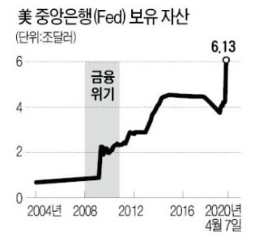 위 그림은 참고용이며 美연방준비제도(FED)의 보유자산 규모의 흐름을 나타낸다. 최근 美연준이 보유한 자산은 6.13조 달러(7,400조원초과) 규모이다.
