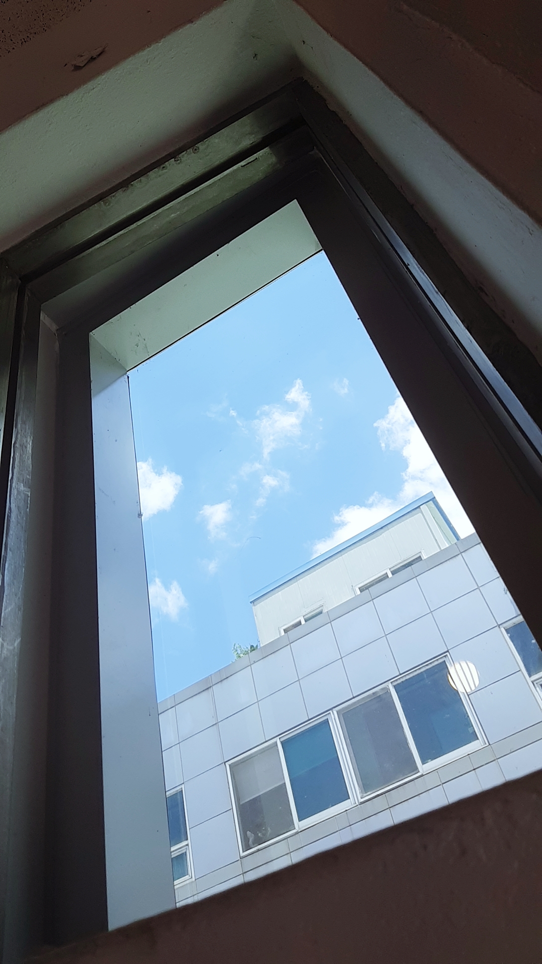 건물 안, 창문에 맑은 하늘과 구름이 있길래 카메라를 켜,