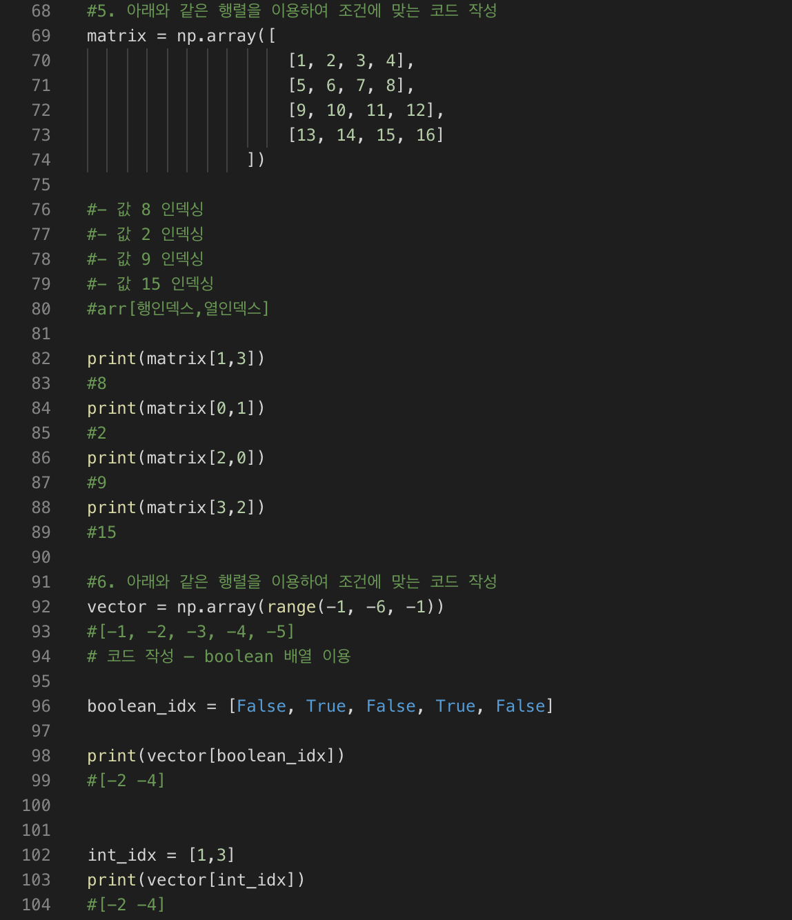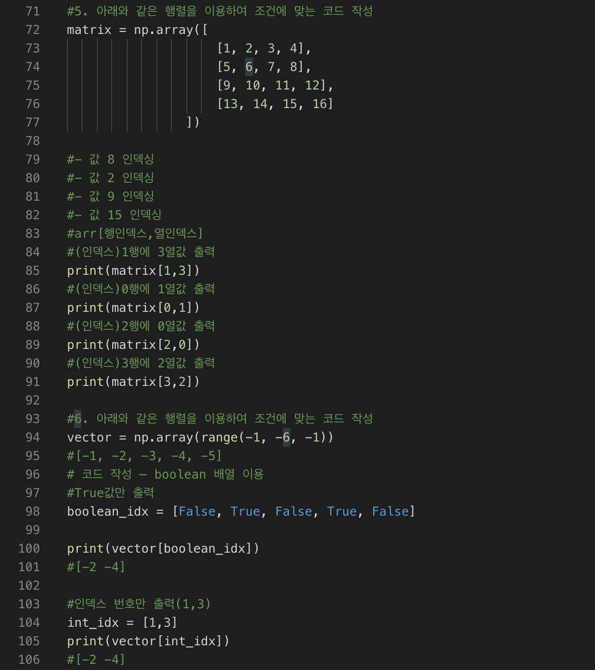 #6. 아래와 같은 행렬을 이용하여 조건에 맞는 코드 작성