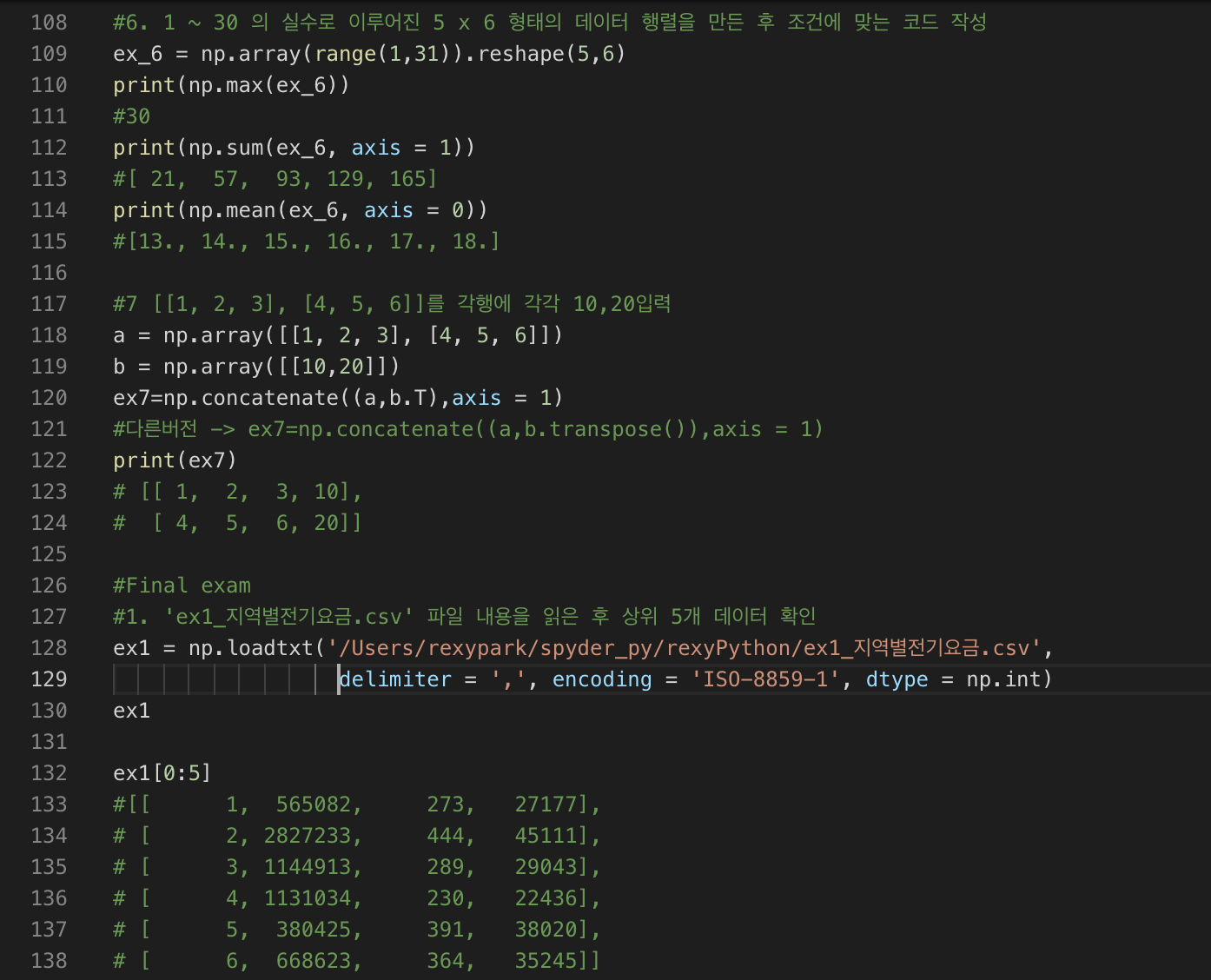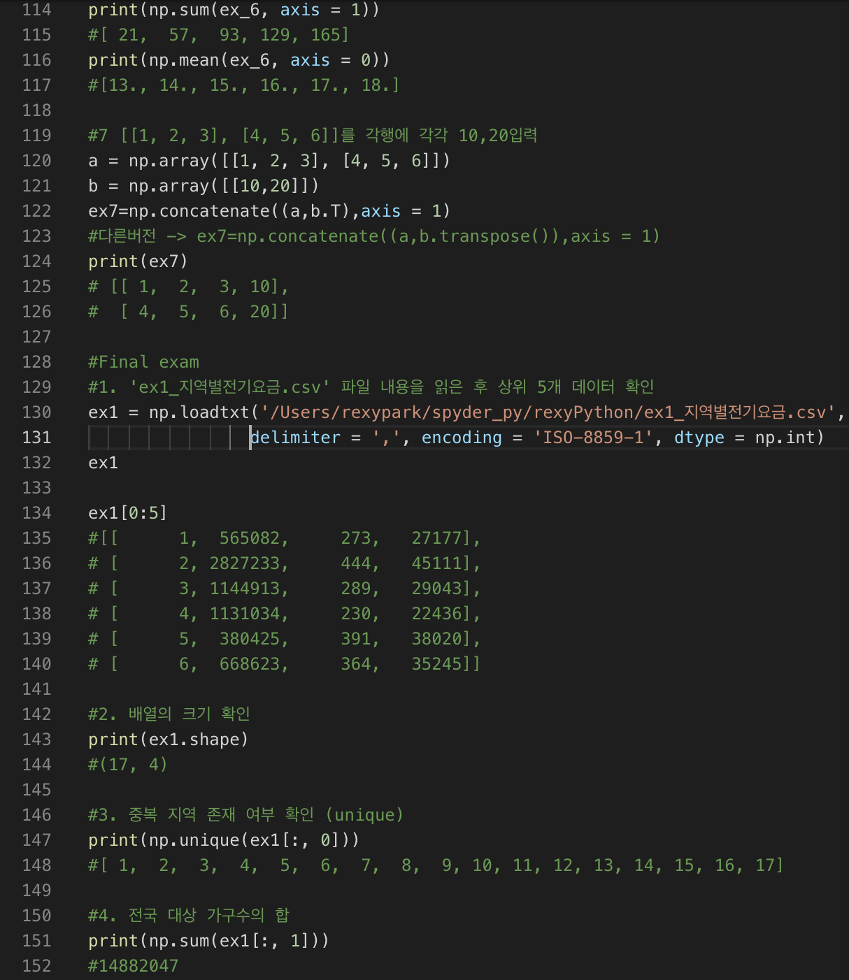 ex1 = np.loadtxt('/Users/rexypark/spyder_py/rexyPython/ex1_지역별전기요금.csv', delimiter = ',', encoding = 'ISO-8859-1', dtype = np.int)