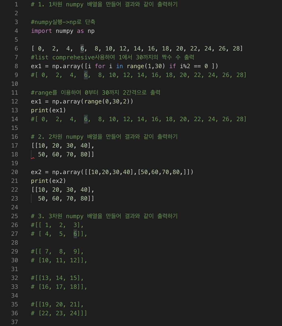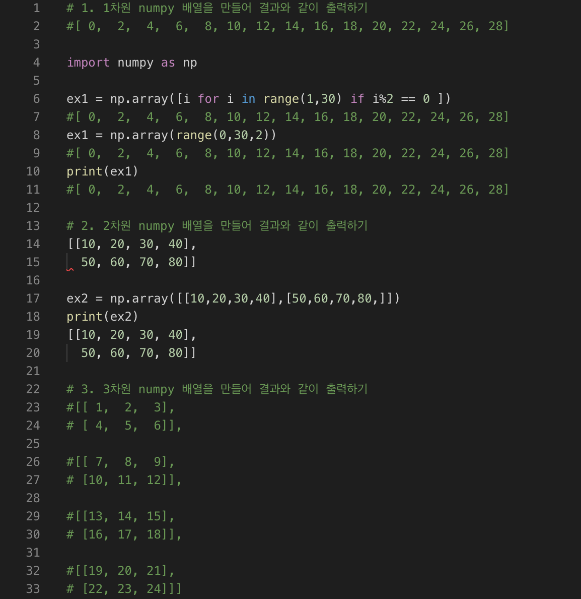 - 1차원 numpy 배열을 만들어 결과와 같이 출력하기