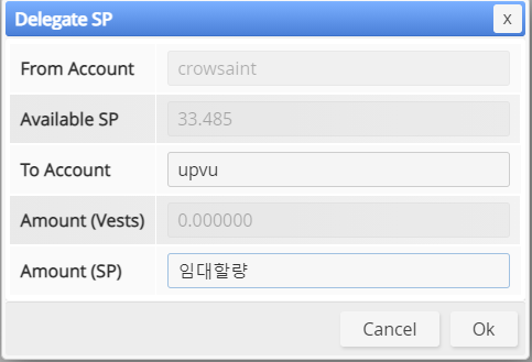 (30분 연구 후)거기에서 델리게이트 sp 드가는거 맞죠? 거기서 to accont에 upvu 라고 적나요? 그리고 어마운트에서는 임대할 스파 수량 기입? 타이핑으로 어려우면 010 2432 9322