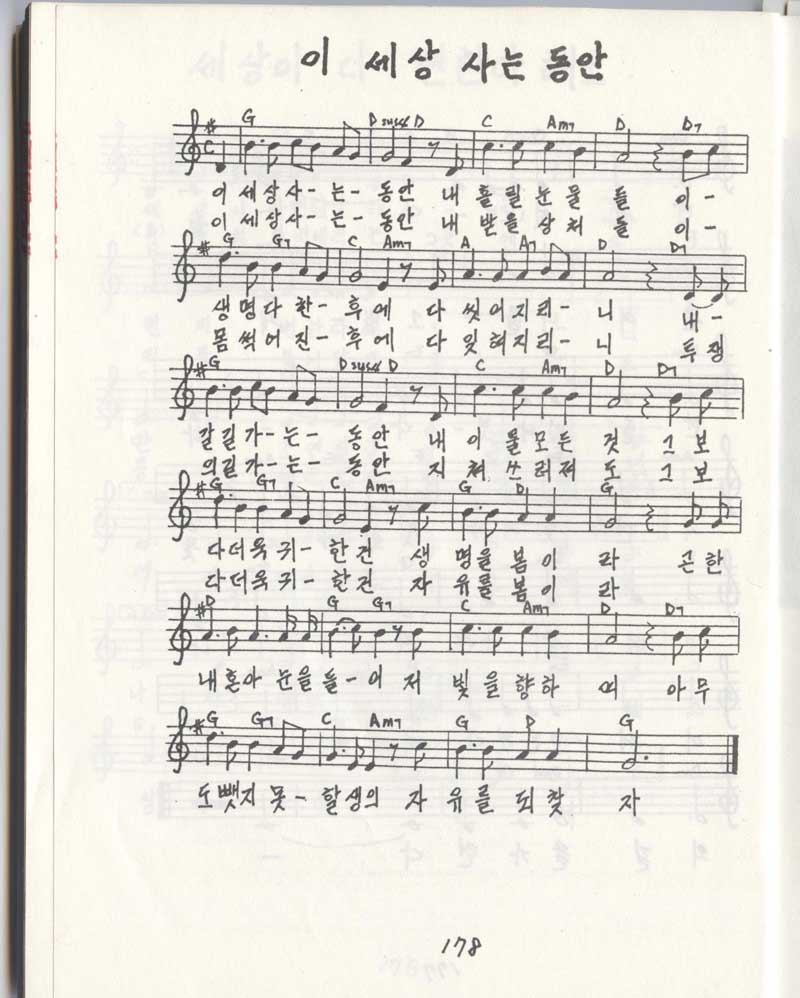 아 또 기억나는 게 있다. 정식이가 나직하게 읊조리던 노래야. 유치장에 앉아서 부르는데 투쟁가 그런 건 아니었고 찬송가 분위기의 운동권 노래였지. ‘이 세상 사는 동안’이라고 했어. 가사를 검색하면 나올 거야.