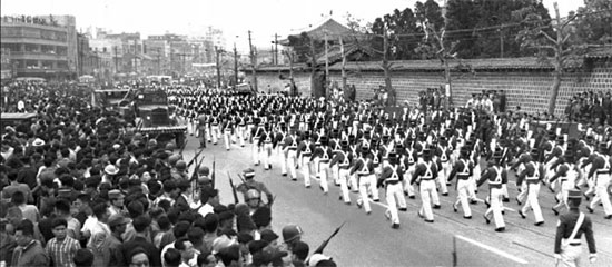 5·16 이틀 뒤 5월18일이면 쿠데타는 거의 성공 단계에 접어들었지만 아직 확고해진 건 아니었어. 당시 쿠데타군의 핵심이었던 김종필 중령의 회고록에 따르면 그날 오전 10시까지도 주한 미군 사령관은 “원대 복귀”를 요구하고 있었거든. 그런데 거의 비슷한 시간대에 서울 시민에게 군사정변이 사실상 성공했음을 각인시키는 이벤트가 펼쳐졌어. 육군사관학교 생도들이 열을 지어 ‘혁명 지지’ 퍼레이드를 벌인 거야. “육군사관학교의 사관생도와 장병들은 종로, 세종로, 태평로 등 수도의 심장부를 꿰뚫고 보무당당히 시가행진을 하면서 5·16 군사혁명을 지지 성원하였다… 연도에 모여든 수만 시민들로부터 박수를 받았다.”(<동아일보> 1961년 5월19일자)