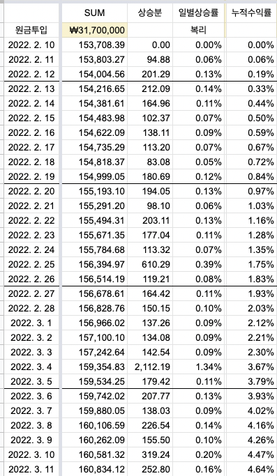 - 매일 복리로 올라가는 숫자와, 누적 수익률을 기록하고 있습니다.
