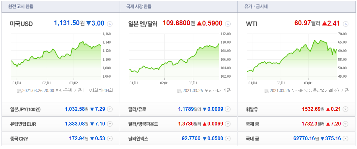 유가는 수에즈운하 사태로 인해 또 상승하였네요.