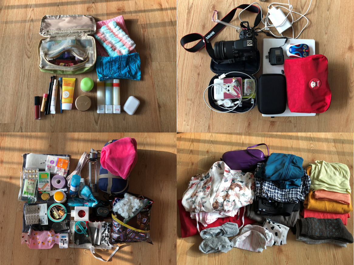 청태이프, 카라비너 여러개, 손톱깎이, 반짓고리, 자물쇠 여러개, 빨래집게, 와이어(빨래걸이 및 보안용), 워터핫팩, 칼, 가위, 항생제, 해열 소염 진통, 비염약, 편두통약, 알러지약, 비타민제, 호랑이연고, 스포츠테이프, 방수팩(샤워할때 물건 지킬용), 헤드렌턴, 발냄새제거제?, 멀티탭, 우산, 경량침낭, 물통, 배게, 안대, 코인티슈, 스니커스(간식)