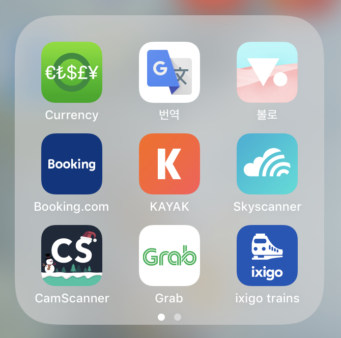 환율앱,번역앱, Booking.com, KAYAK, Skyscanner, CamScanner, Grab, ixigo trains (인도 기차 시간표 확인용), 맵스미, 구글지도, 트라비포켓(여행가계부)