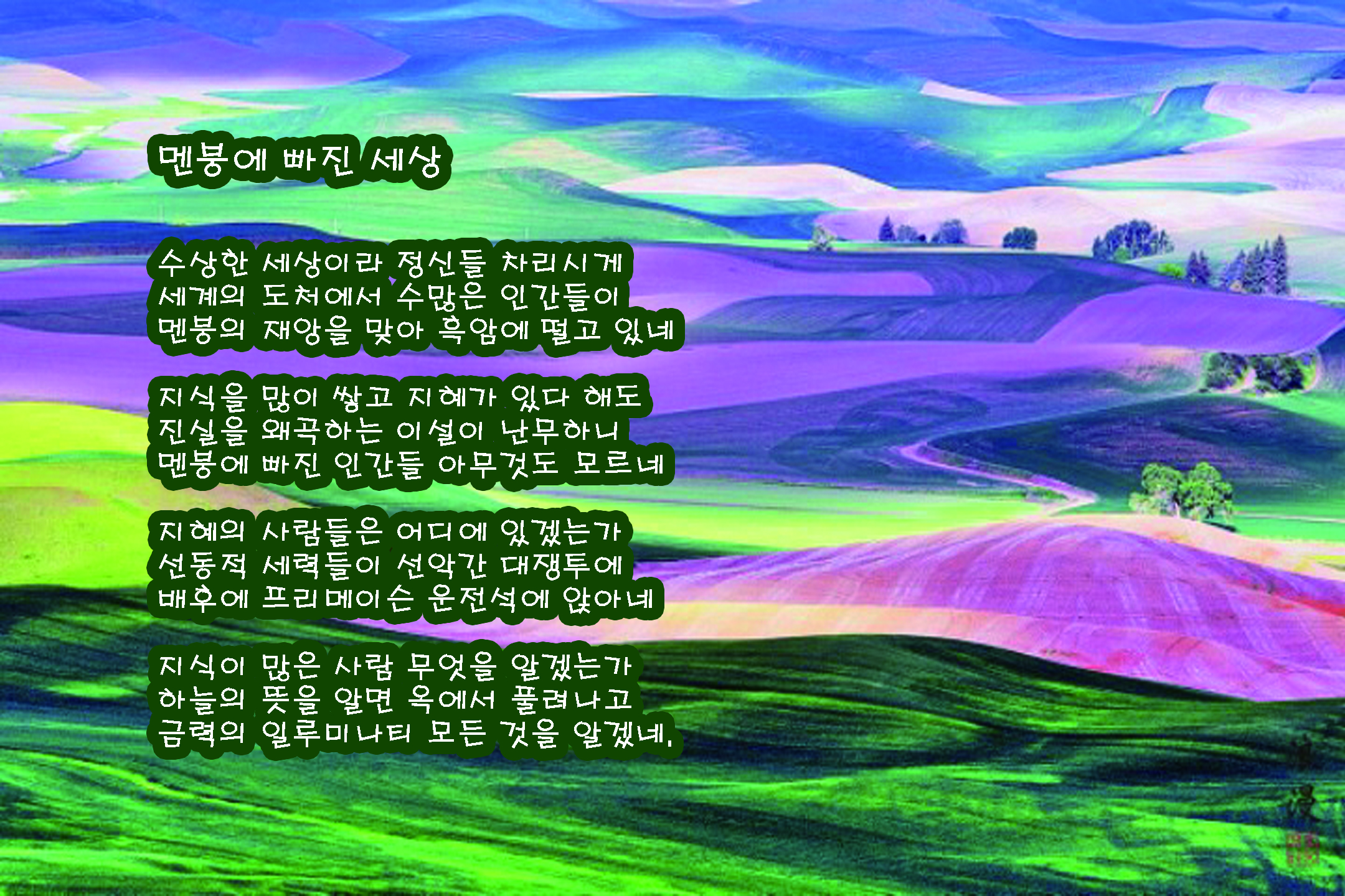 Poem - 멘붕에 빠진 세상sh1 (54)in #kr • 8 years ago 멘붕에 빠진 세상 수상한 세상이라 정신들 차리시게 세계의 도처에서 수많은 인간들이 멘붕의 재앙을 맞아 흑암에 떨고 있네 지식을 많이 쌓고 지혜가 있다 해도 진실을 왜곡하는 이설이 난무하니 멘붕에 빠진 인간들 아무것도 모르네 지혜의 사람들은 어디에 있겠는가 선동적 세력들이 선악간 대쟁투에 배후에 프리메이슨 운전석에 앉아네 지식이 많은 사람 무엇을 알겠는가 하늘의 뜻을 알면 옥에서 풀려나고 금력의 일루미나티 모든 것을 알겠네. #steem #interesteem #jyinvest #jjangjjangman