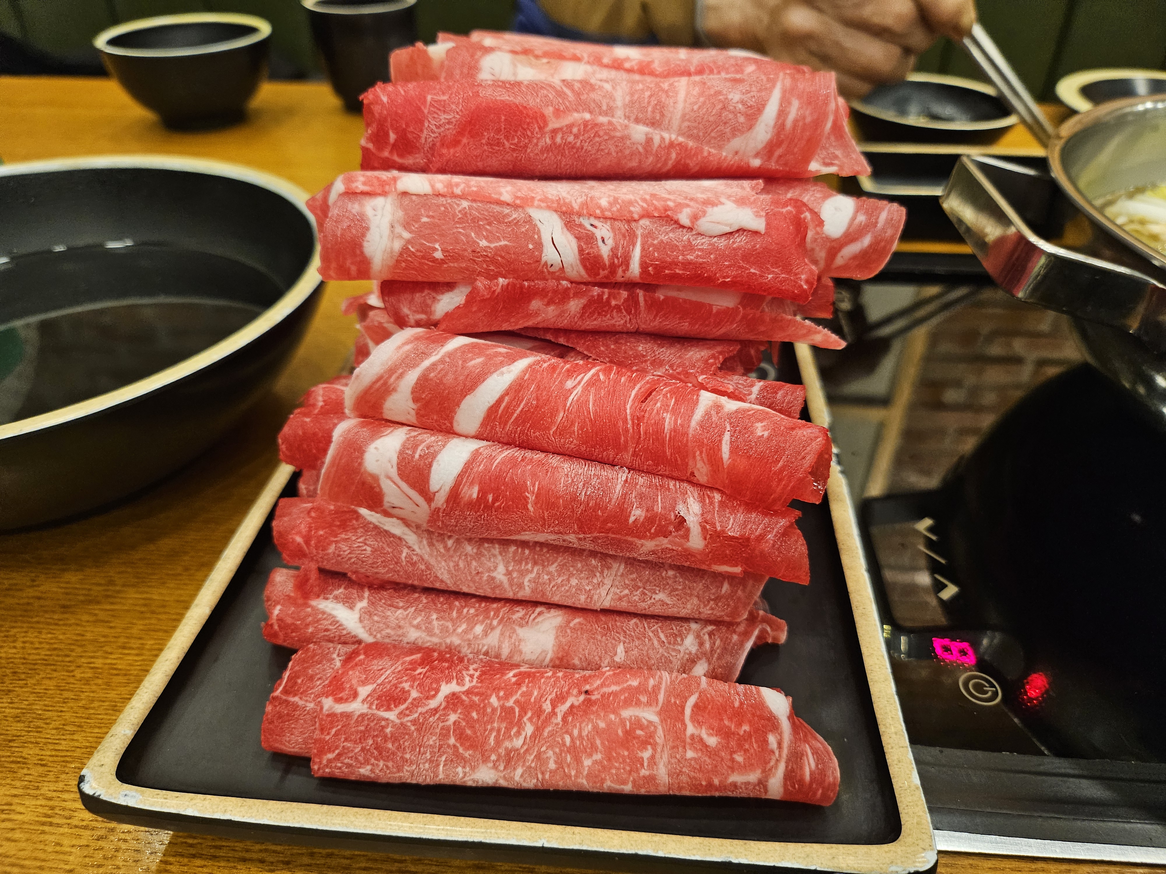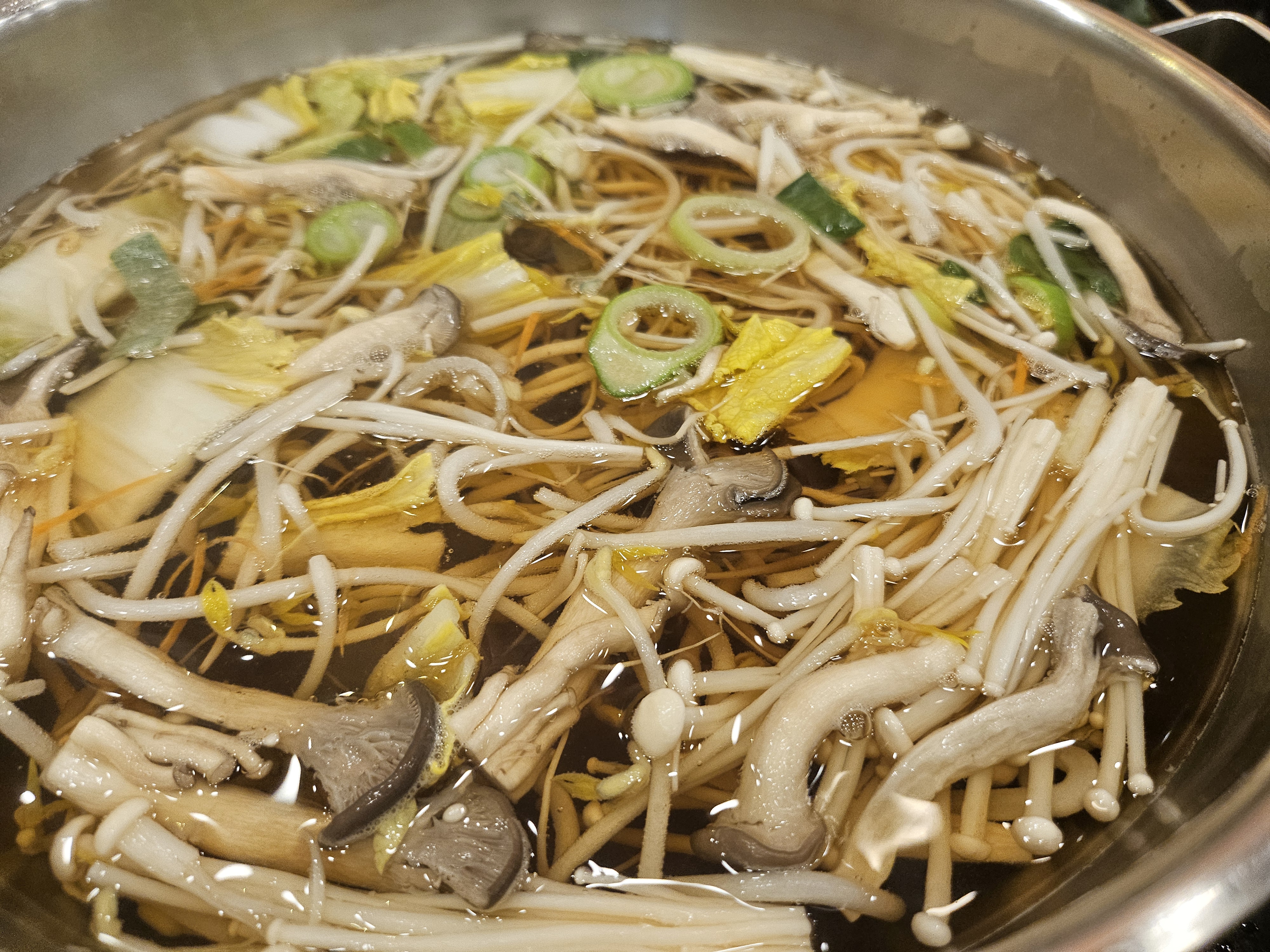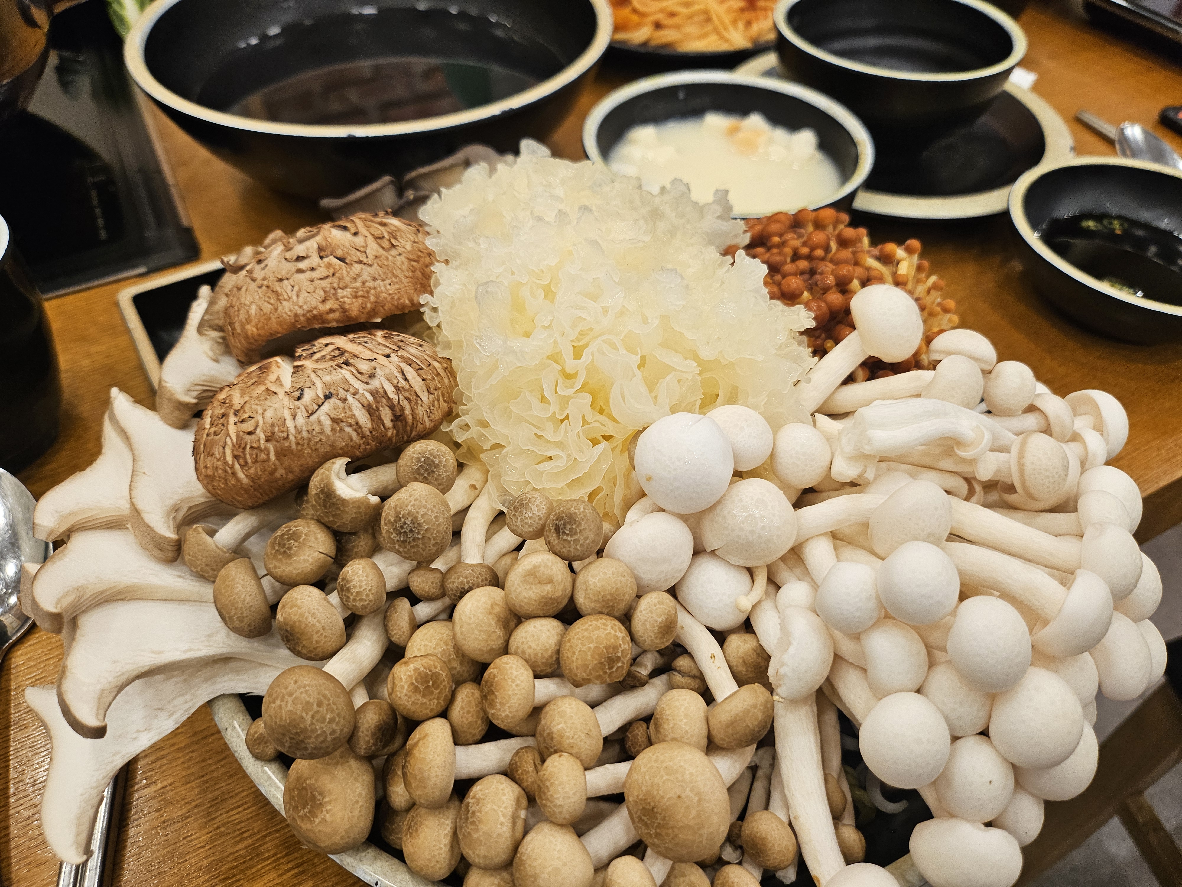 국물에 소고기 살짝 익혀 버섯, 야채들과 함께 소스에 찍어 먹는 맛이 일품이다